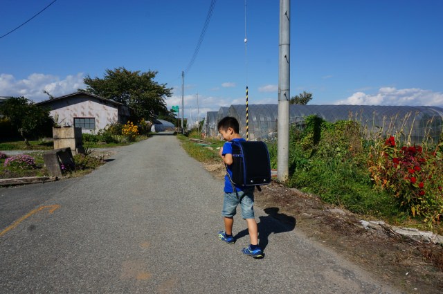 ランドセルの中身の大半を占める教科書。お勉強がたのしみなあいとくんは重たい教科書も元気いっぱいに歩いて運びます。
