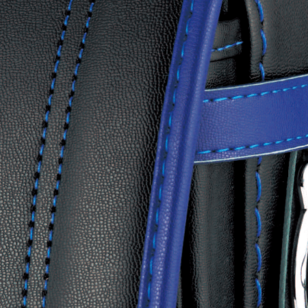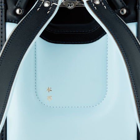 背あての優しい淡いスカイブルーのふっくら天然牛革が、お子さまの背中をそっと馴染み、
