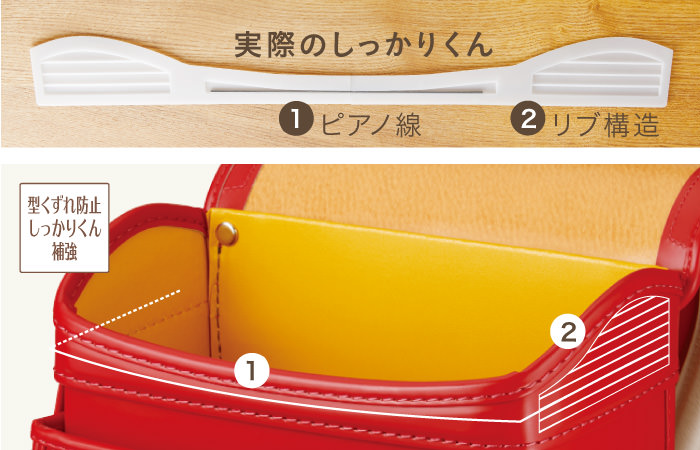 キューブ型のランドセルには潰れやすい、というイメージをお持ちの方もいらっしゃると思いますが、「カバンのフジタ スペシャリティランドセル」にはフジタ自慢の”しっかりくん”という頑丈な補強材を使うことで、潰れにくくしています♪