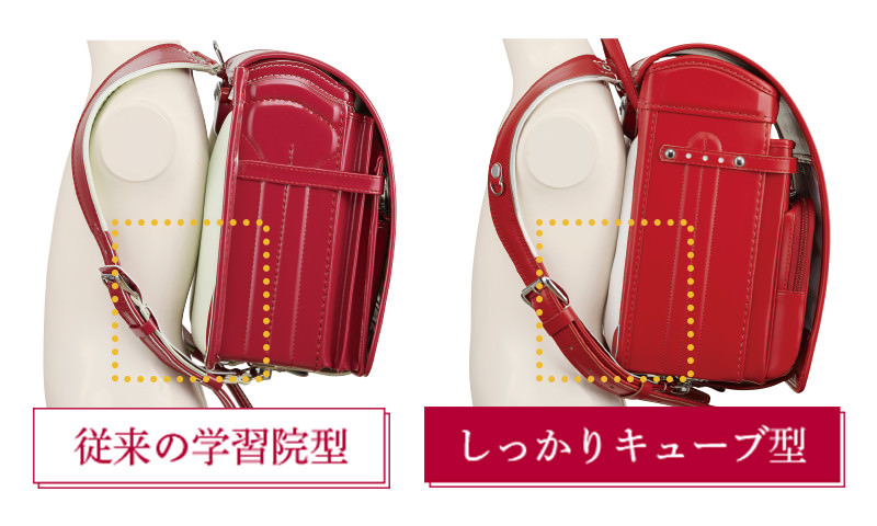 フジタのランドセルは、お子さまの背中と接する面が広い=「ランドセルの重みを分散して背中全体で支えるつくり」となっております。