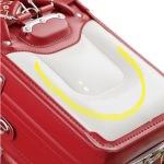 お子さまが走りまわると、ランドセルも飛び跳ね、教科書が上下左右にガックガクッ!なんて光景を目にしたことはございませんか。こんなとき、少しでも左右へ揺れる幅を少なくするため、フジタのランドセルは、左右2辺を盛り上げておつくりしています。
