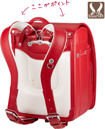 体重に比例しますと、お子さまのランドセルは大人が12kgの荷物を背負うことと同じです。フジタはこのXカーブベルトの「肩・胸での分散型ベルト」が新一年生には一番負担が少ない、軽く感じる背負い心地だと考えました。