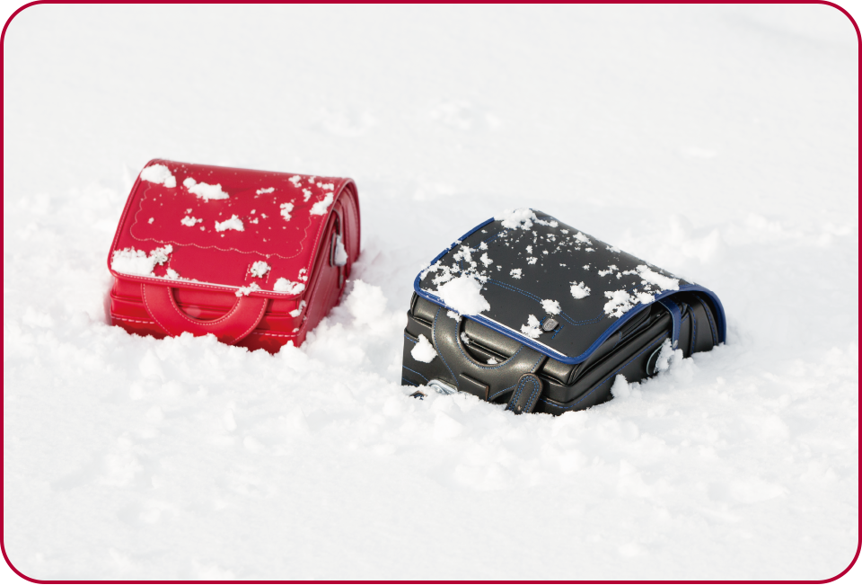 ランドセルを雪の上に置いたままでも問題ないよう、牛革もコードバンも防水加工をいたしました。