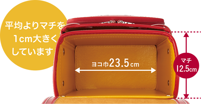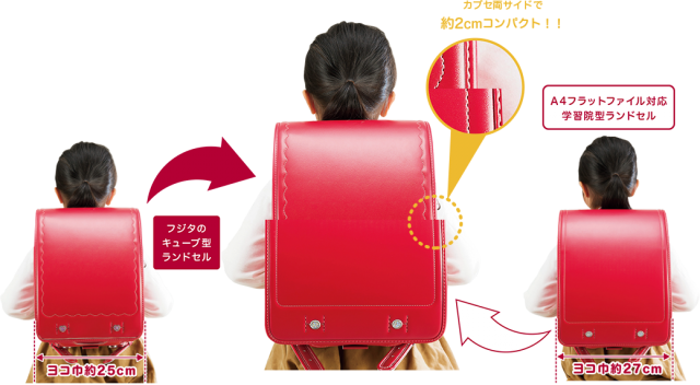 キューブ型ランドセルは、改定前の「A4クリアファイル」対応の外寸のまま、中身は「A4フラットファイル」が入り、「コンパクトだけど大容量」を実現いたしました。