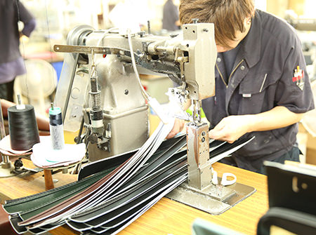 部材を仮止めするために糊で貼り合わせたあとは、職人の手で縫製していきます。