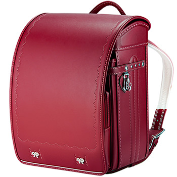 スタンダードな赤の本体に、フジタこだわりのピンクステッチと、リボン型の飾り鋲を施したランドセルです。
