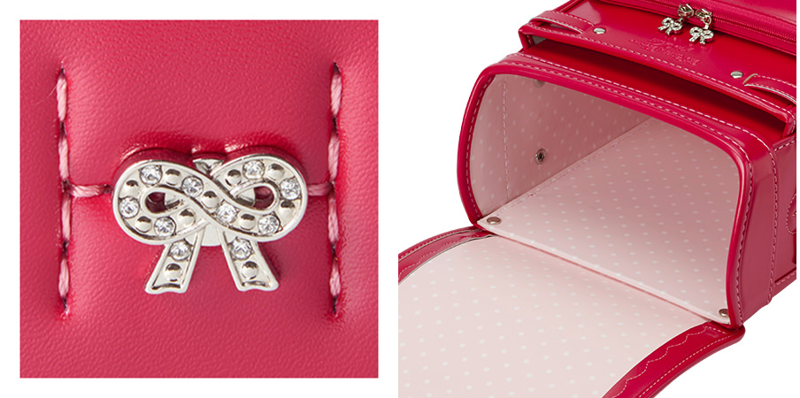 リボンの鋲、ドット柄の内装は、かわいいですが甘くなりすぎない雰囲気なので、ビビットピンクとの相性もバツグン!
