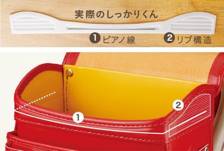 しかしフジタのキューブ型ランドセルは、開口部にしっかりと補強材を入れており、つぶれや変形に強くしております。