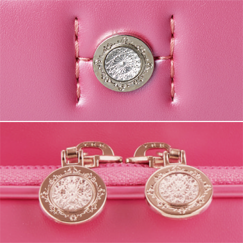 かぶせ鋲やファスナー引き手には、キラキラと輝く宝石モチーフの鋲を使用。