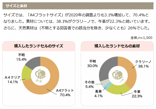 牛革のランドセルが全体の22.3%なので、2021年の調査ではクラリーノ製のランドセルを購入した家庭が多いということですね。
