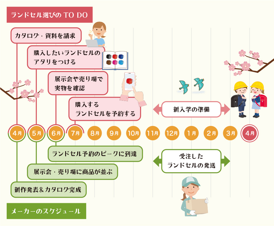 人気のモデルやカラーや気に入ったランドセルを確実に購入するには、ランドセルメーカーのスケジュールを把握しておかないと出おくれてしまいますよ!