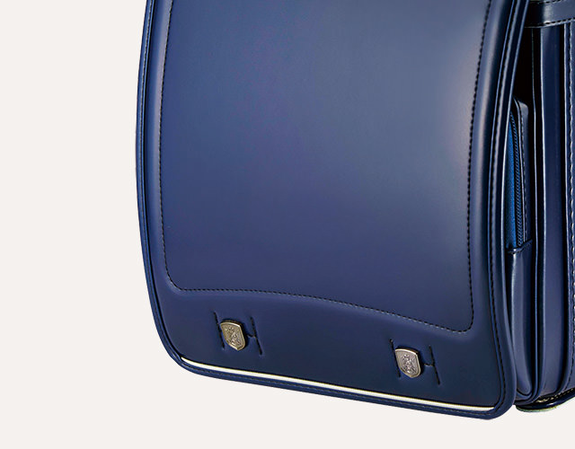 こちらは「ブルー」をテーマにしたランドセル。マリンブルーの本体にアクセントを加えるヘリは3色から選べます。青いランドセルの中に、自分らしさを表現したいお子さまにぴったりのランドセルです。このシリーズの背あては、さわやかなスカイカラーを採用。見えないところも、ブルーで統一しました。