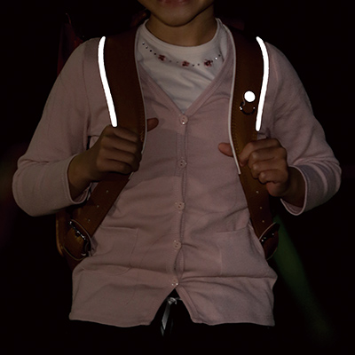 前方から来る車や自転車には肩ベルトに沿った反射板が光ります