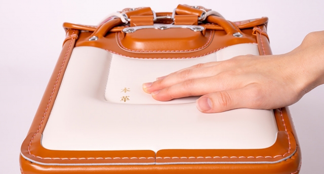 そのため、フジタでは人工皮革(クラリーノ)のランドセルでも肌に触れる肩ベルトと背当ての部分はあえて天然牛革を使用しています。