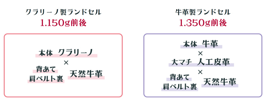 一般的に“重い”と言われる牛革でも約1,350gと軽いランドセルになっています。