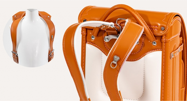 正面から見ると、アルファベットの“X”のようにカーブした肩ベルト。肩・胸・脇腹に沿って体にフィットします。こだわったのは形状だけではありません。ベルトの素材には“ふっくら天然牛革”を使用。天然素材ならではの肌なじみの良さと通気性で快適に、そして一人ひとりの子供の成長に合わせてなじんでいく素材です。