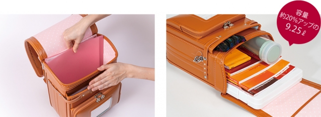 年々荷物が増える小学生のために、大マチは横23.5cm✕マチ12.5cmの大容量を確保。教材が増える高学年になっても十分な容量です。