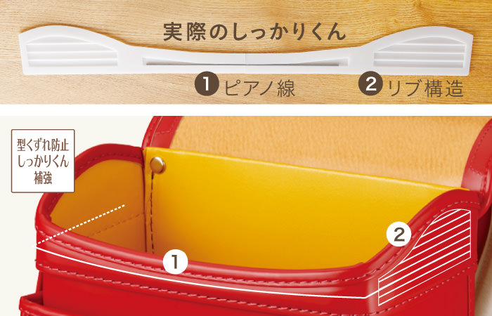 フジタでは、「しっかりくん」とよばれる補強材をいれるなどしてランドセル自体の耐久性をあげております。