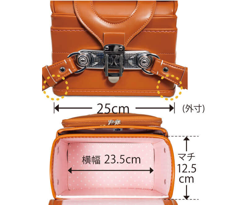 一方の「キューブ型」は特殊なミシンを使い、本体と背あてを内側から縫い合わせています。外観は出っ張りがなくスッキリコンパクトに、容量も確保できるようになりました。コロンとしたかわいい見た目と大容量が受けて「キューブ型」のランドセルは人気商品になりました。