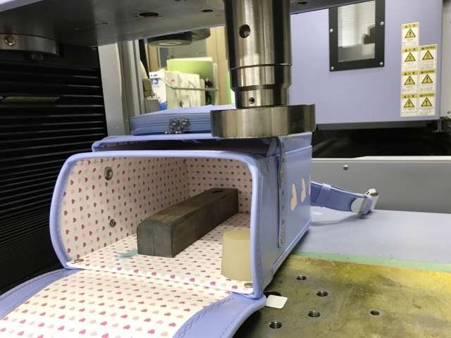 画像のように、ランドセルの上部(かぶせ側)より一定の圧力をかけて、ランドセルに圧力をかけていきます。