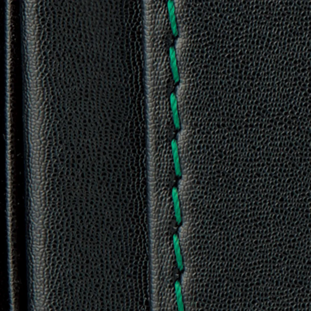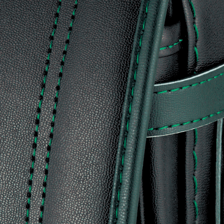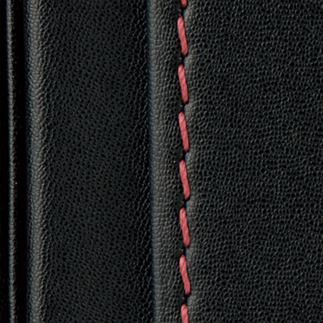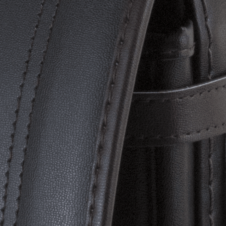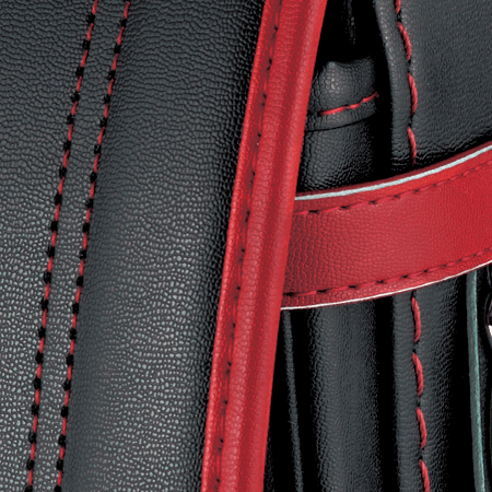 背あては肌あたりと通気性のよい「ふっくら天然牛革」を使用。クールな印象とは反対に、背中をやさしくつつみます。厳しい色落ち試験をクリアしているので、衣類への色移りも心配ありません。