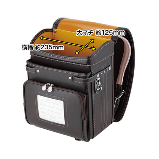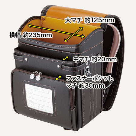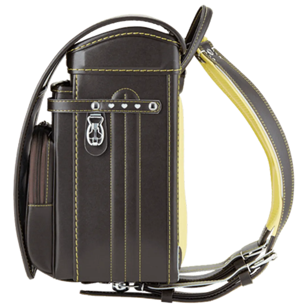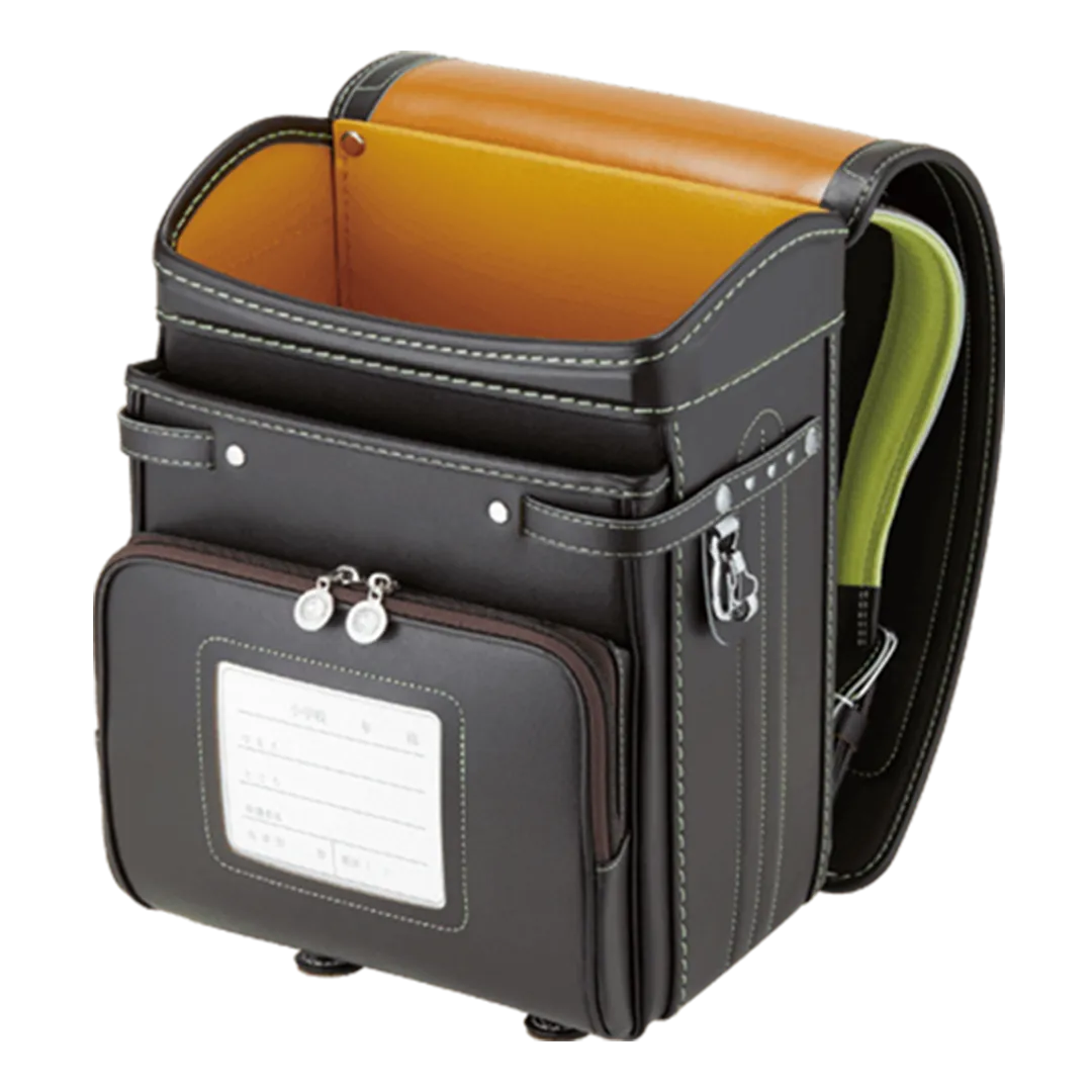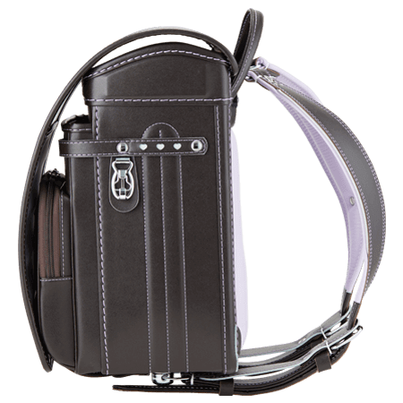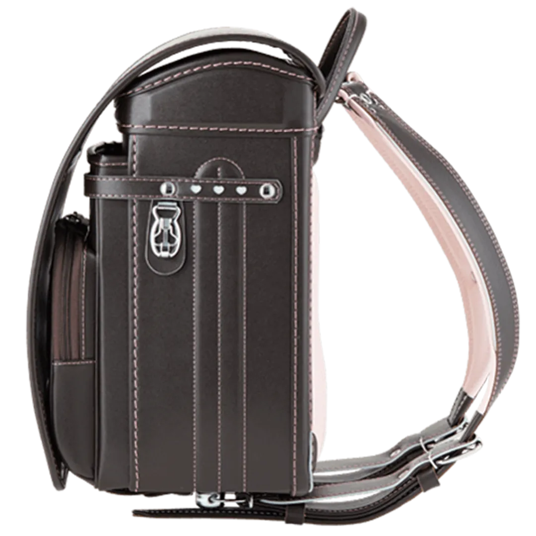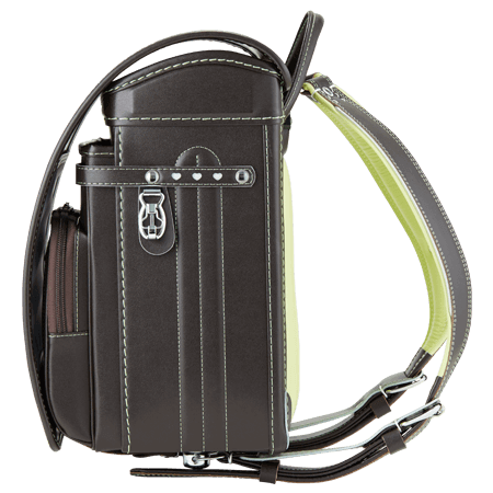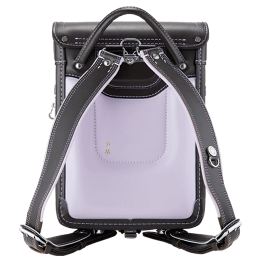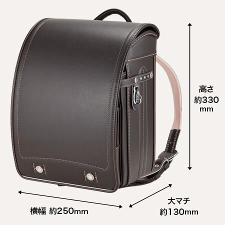 落ち着いたブラウンに映える5色のパステル調の背あてにはふっくら天然牛革を使用。高学年になっても飽きのこない美しいデザインです。