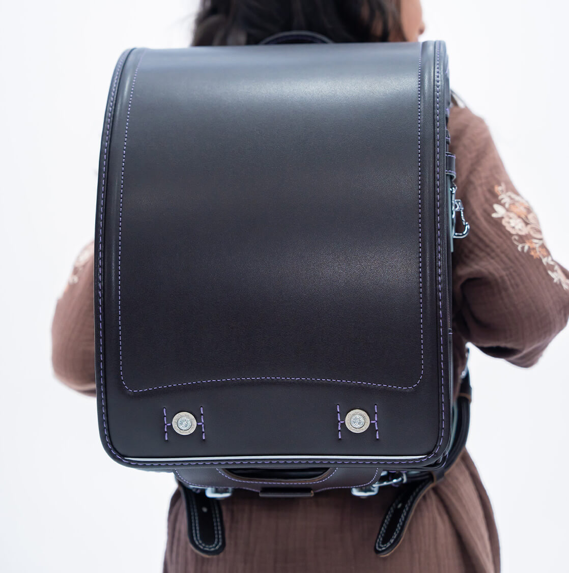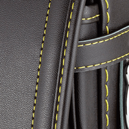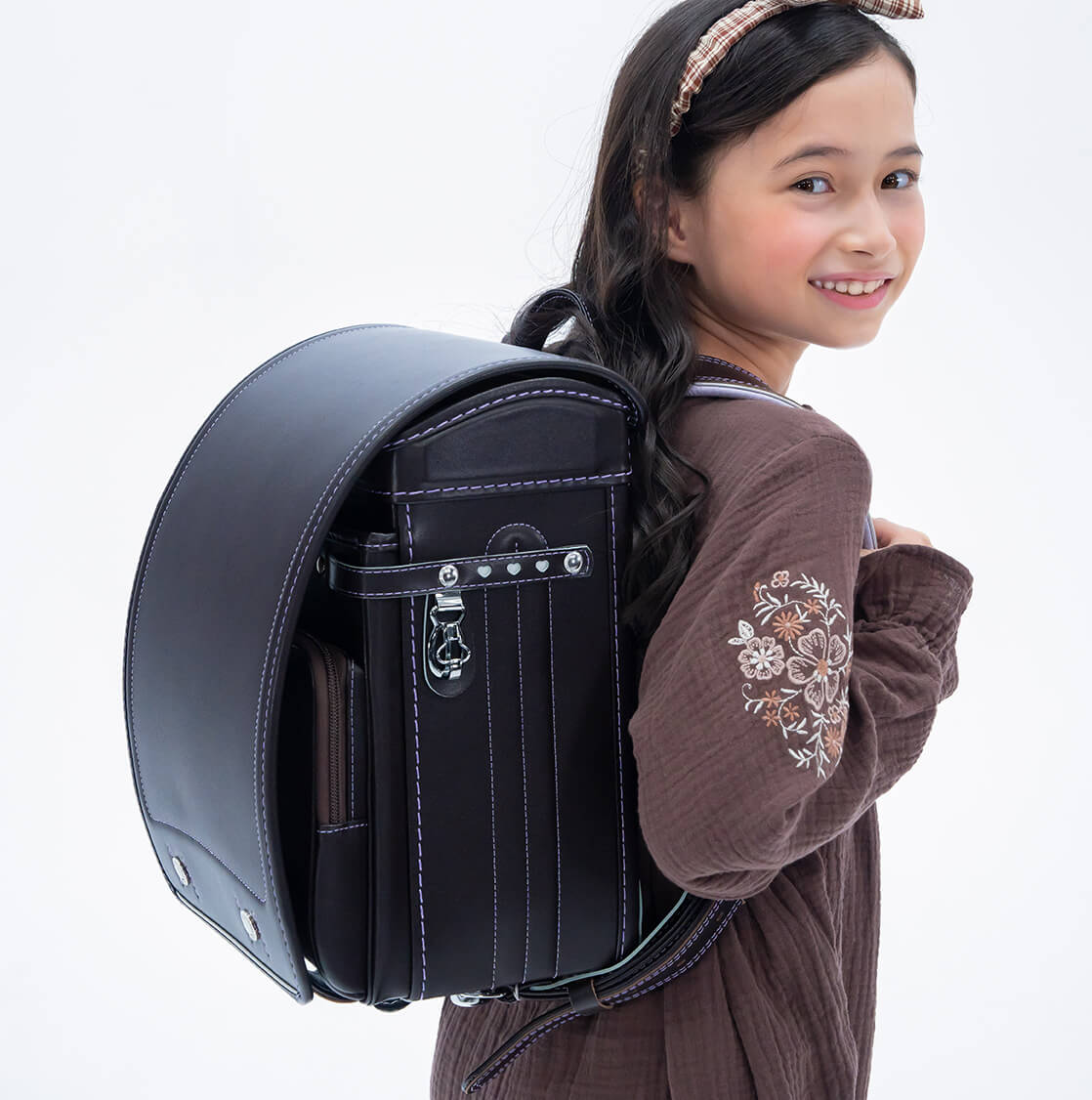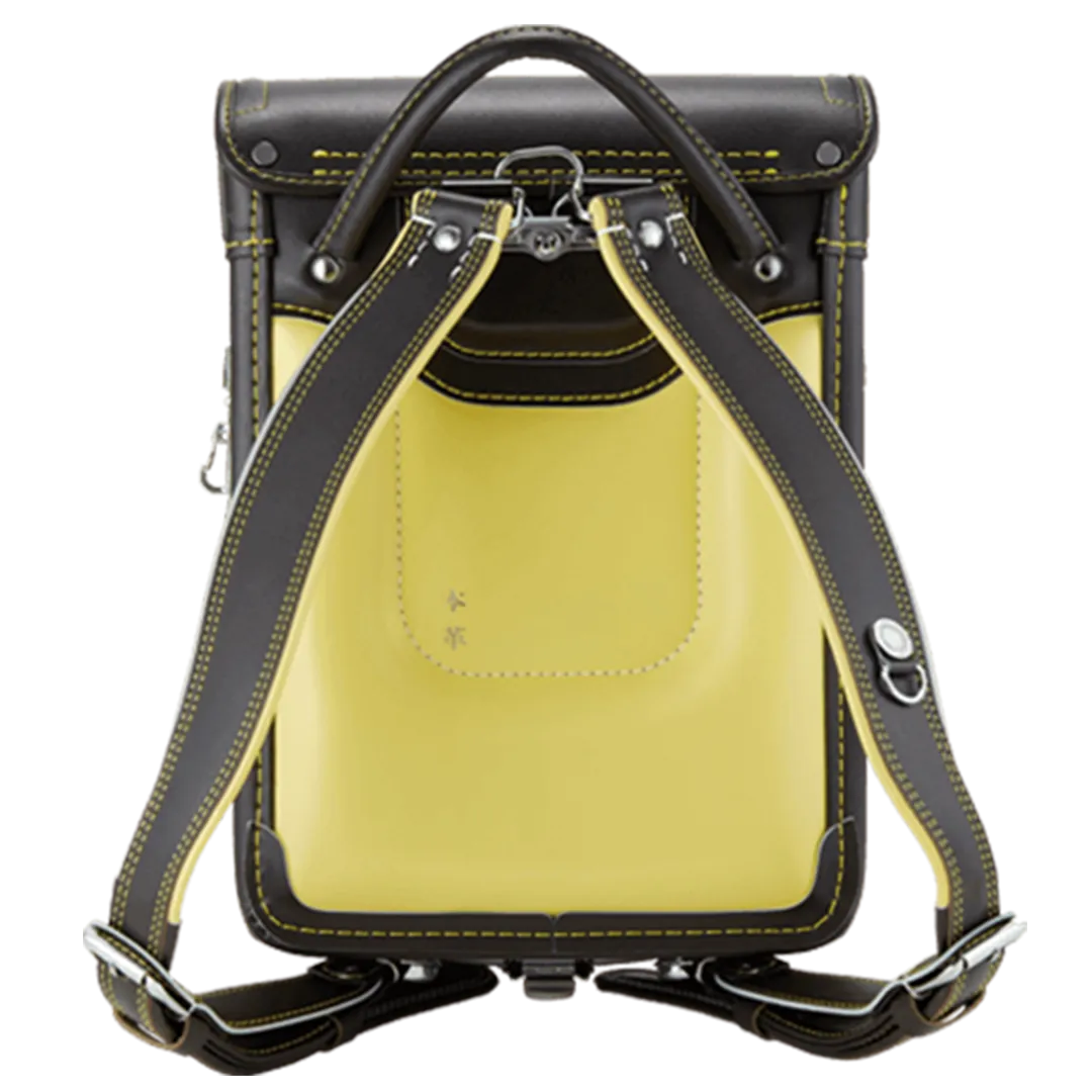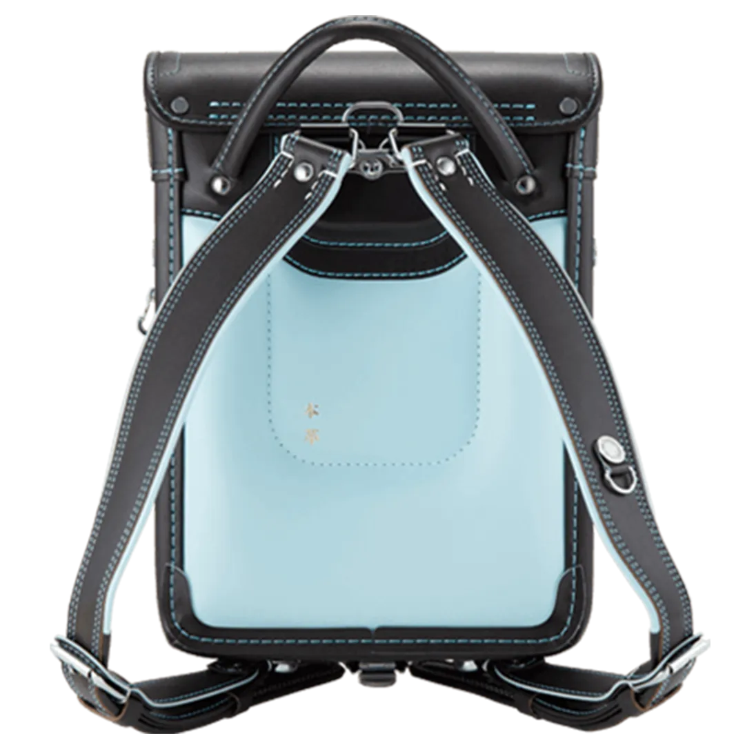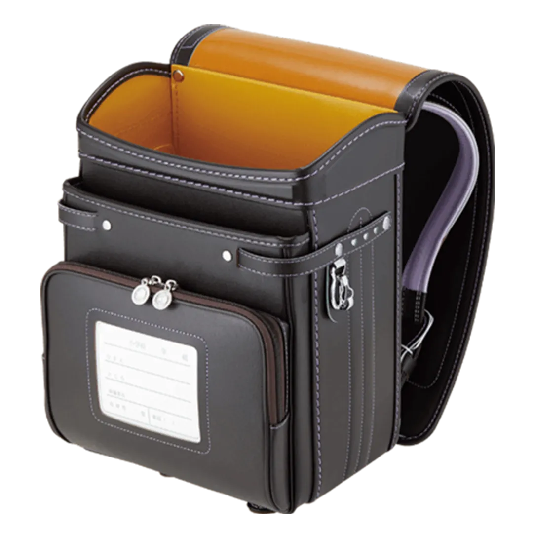 落ち着いたブラウンに映える5色のパステル調の背あてにはふっくら天然牛革を使用。高学年になっても飽きのこない美しいデザインです。