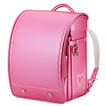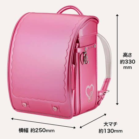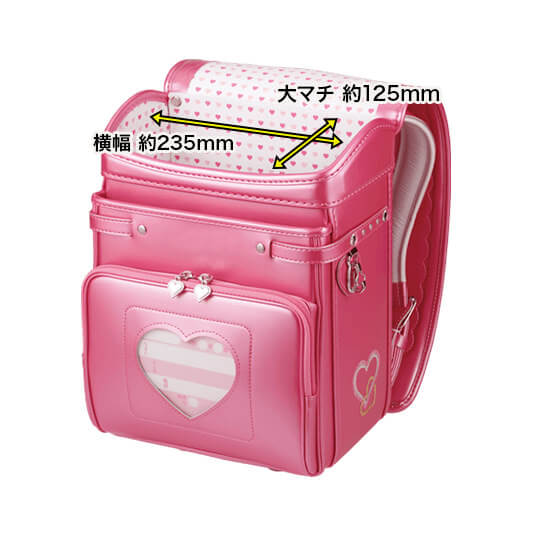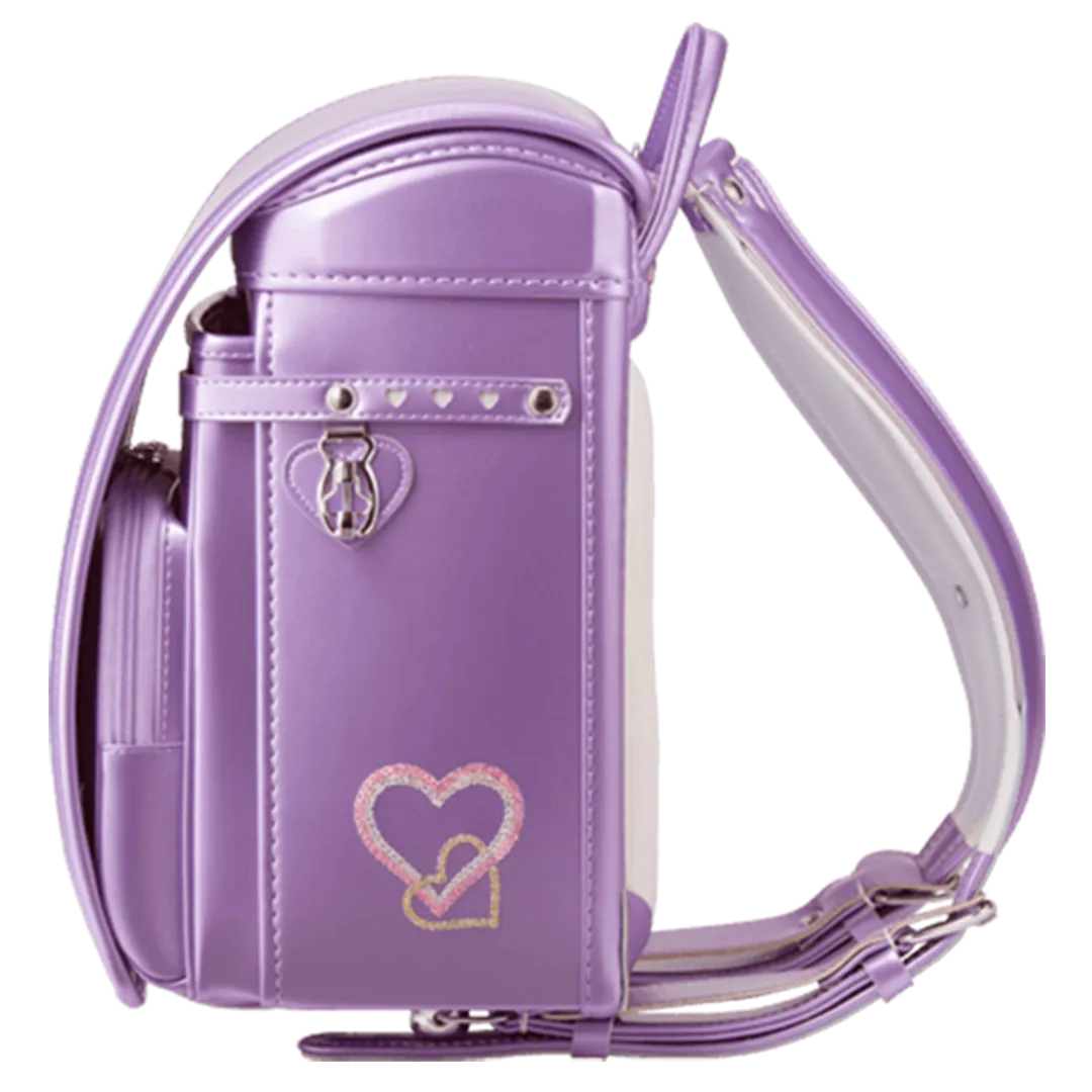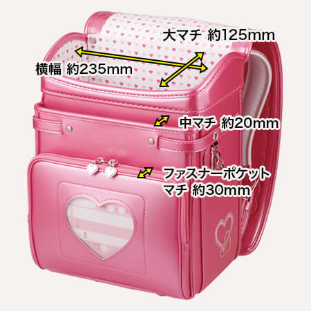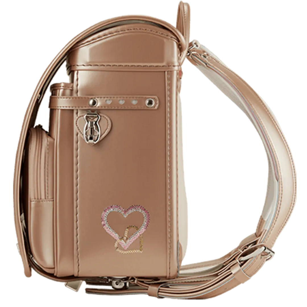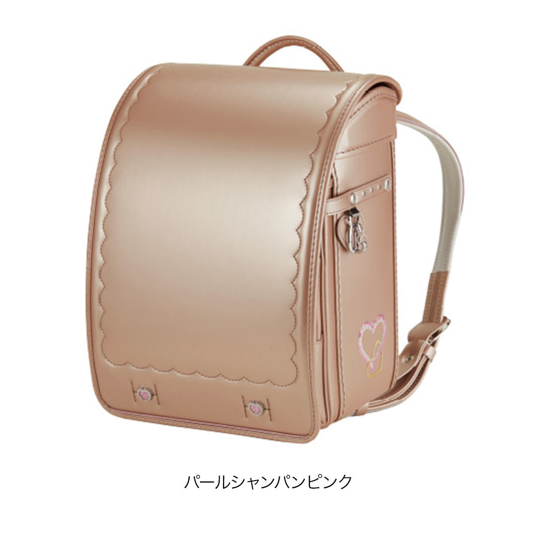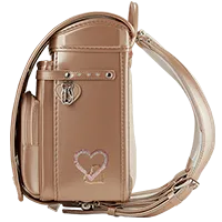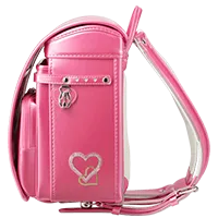 両サイドにキラキラ光るハートがかわいいランドセル。飾り鋲にも内装にも女の子が大好きなハートモチーフが散りばめられています。