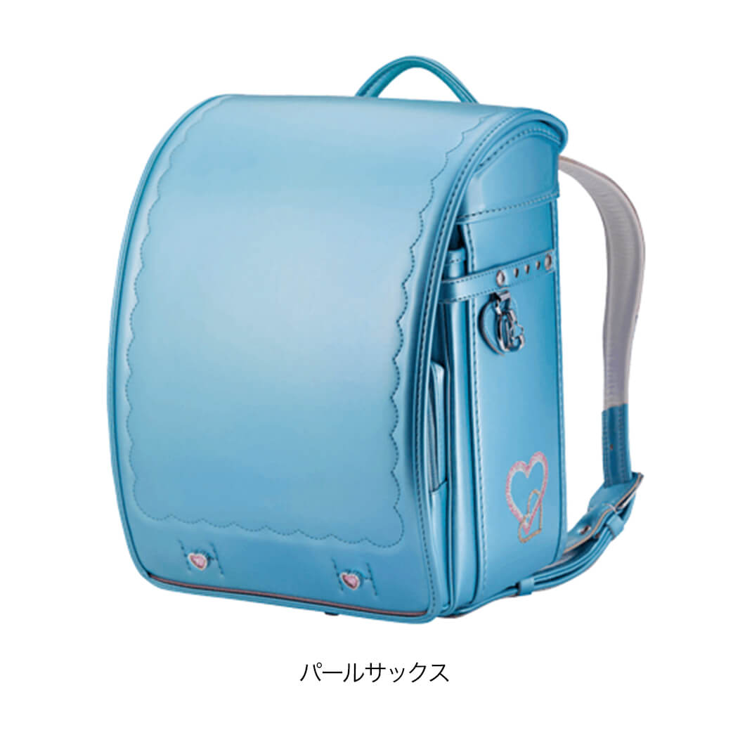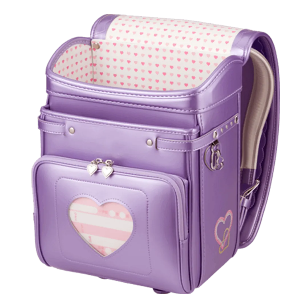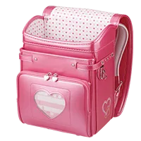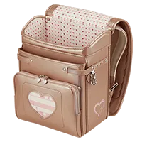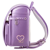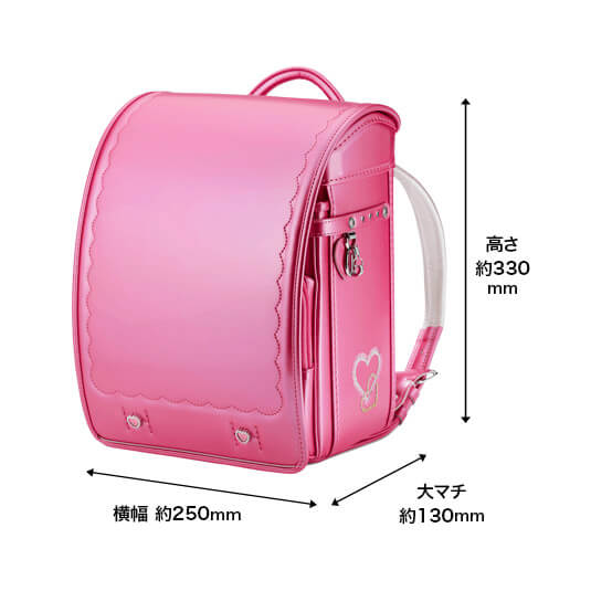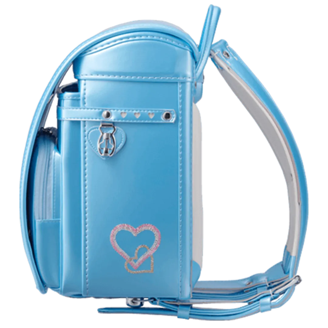 両サイドにキラキラ光るハートがかわいいランドセル。飾り鋲にも内装にも女の子が大好きなハートモチーフが散りばめられています。