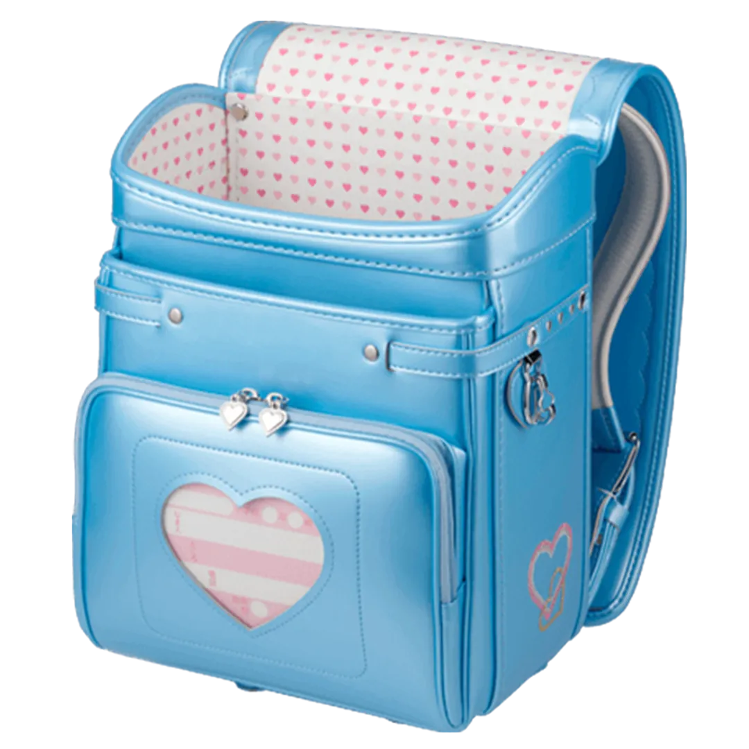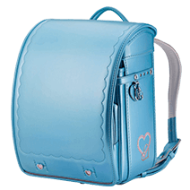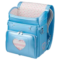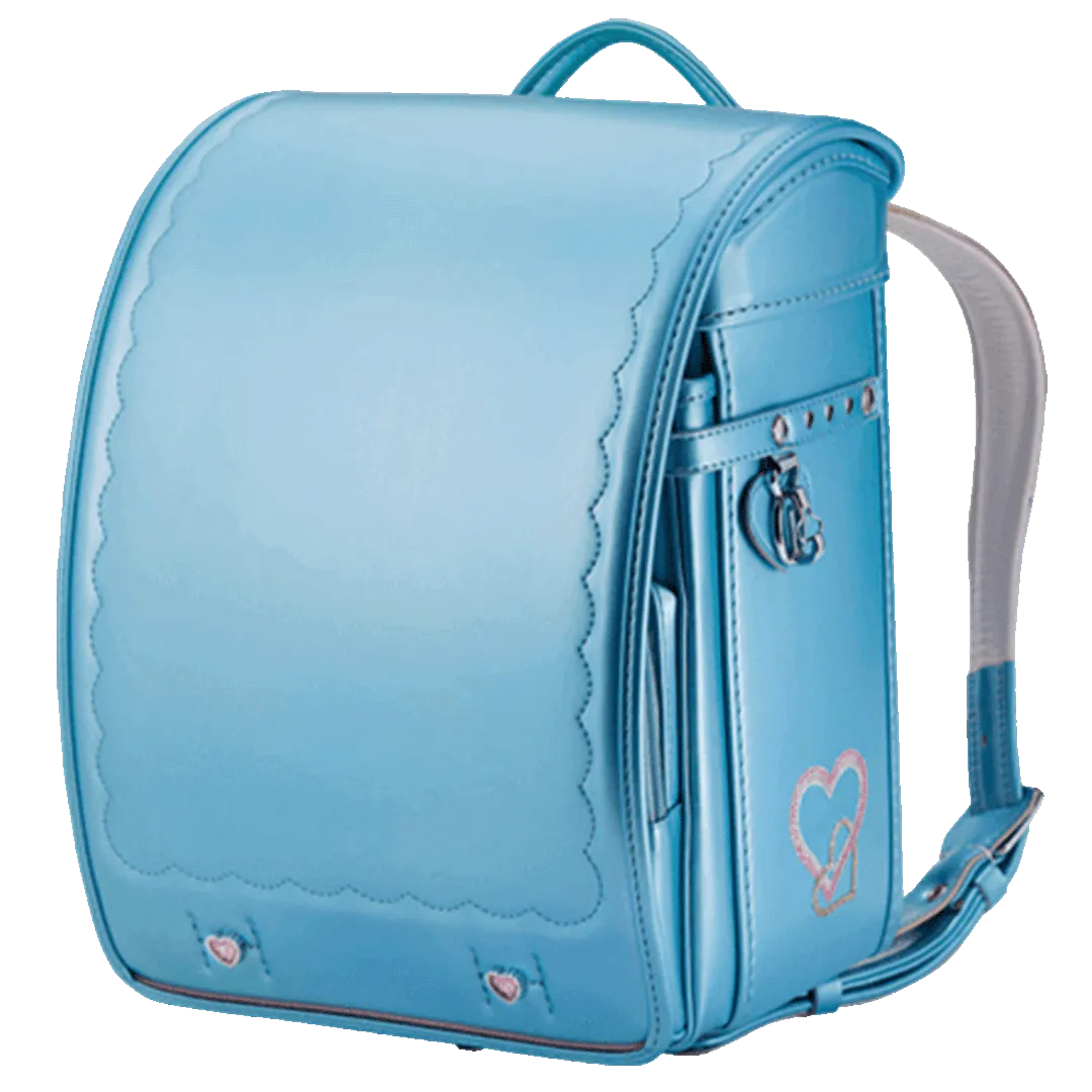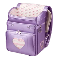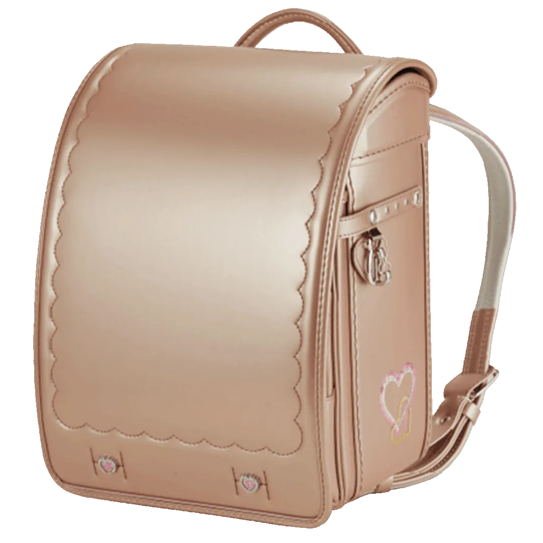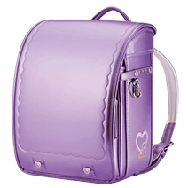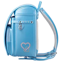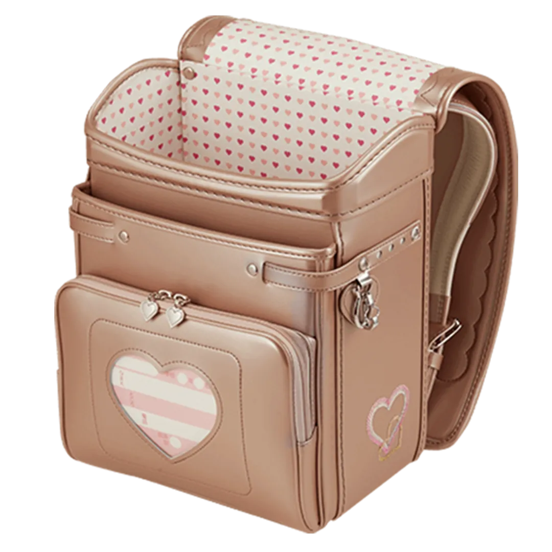 両サイドにキラキラ光るハートがかわいいランドセル。飾り鋲にも内装にも女の子が大好きなハートモチーフが散りばめられています。