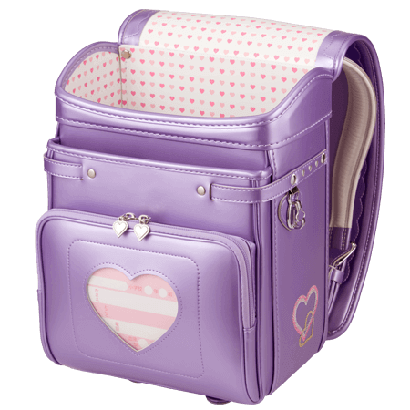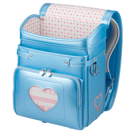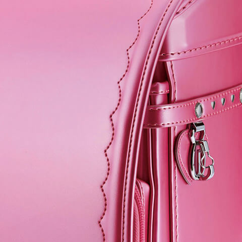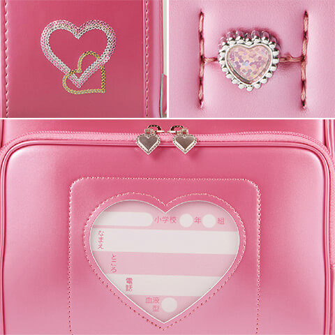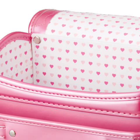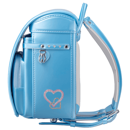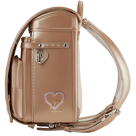 両サイドにキラキラ光るハートがかわいいランドセル。飾り鋲にも内装にも女の子が大好きなハートモチーフが散りばめられています。