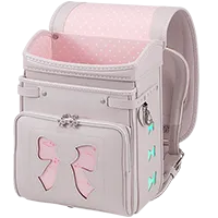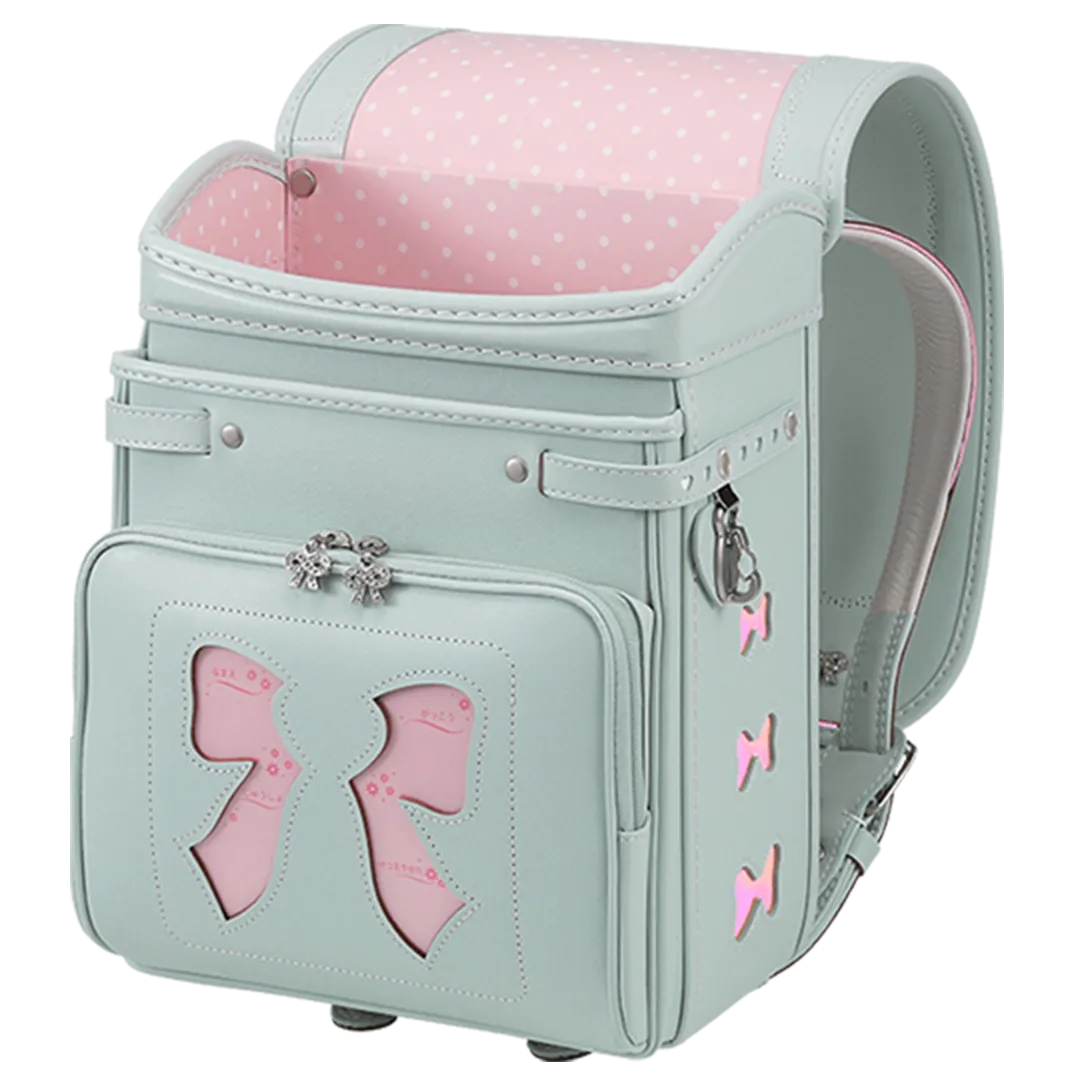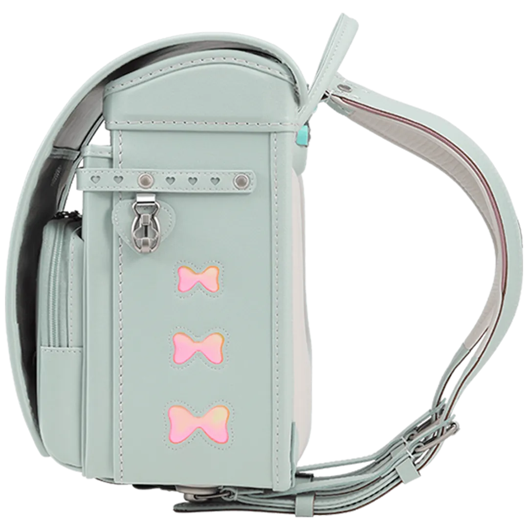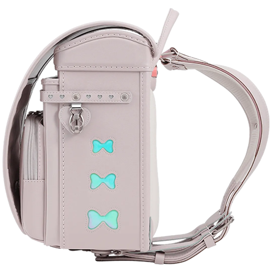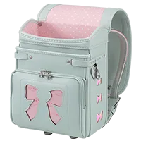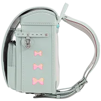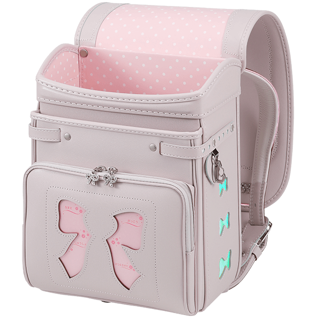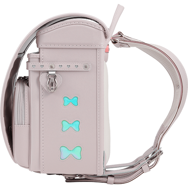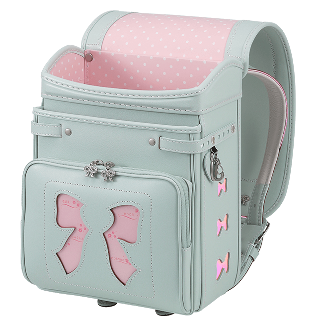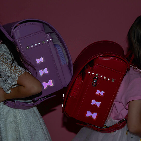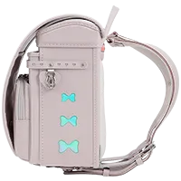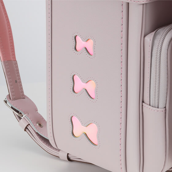 他にはない、上品なパステルカラーが魅力的なランドセル。昼も夜も光るリボンで特別なデザインを楽しんで。