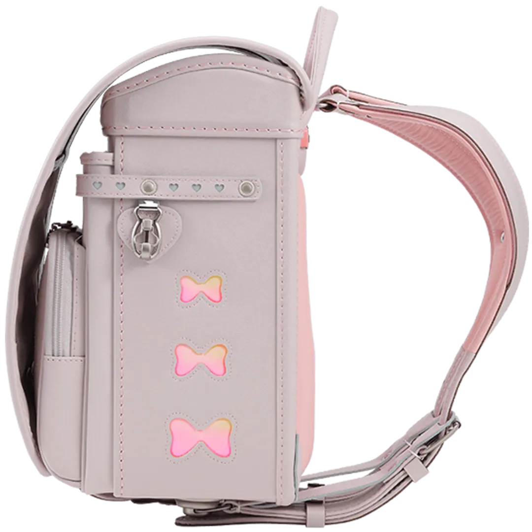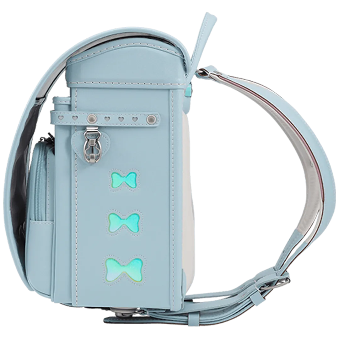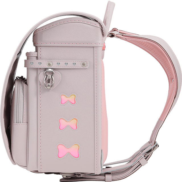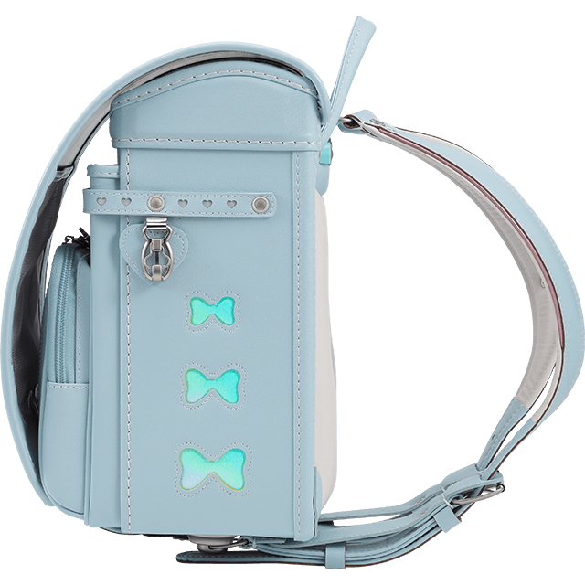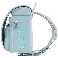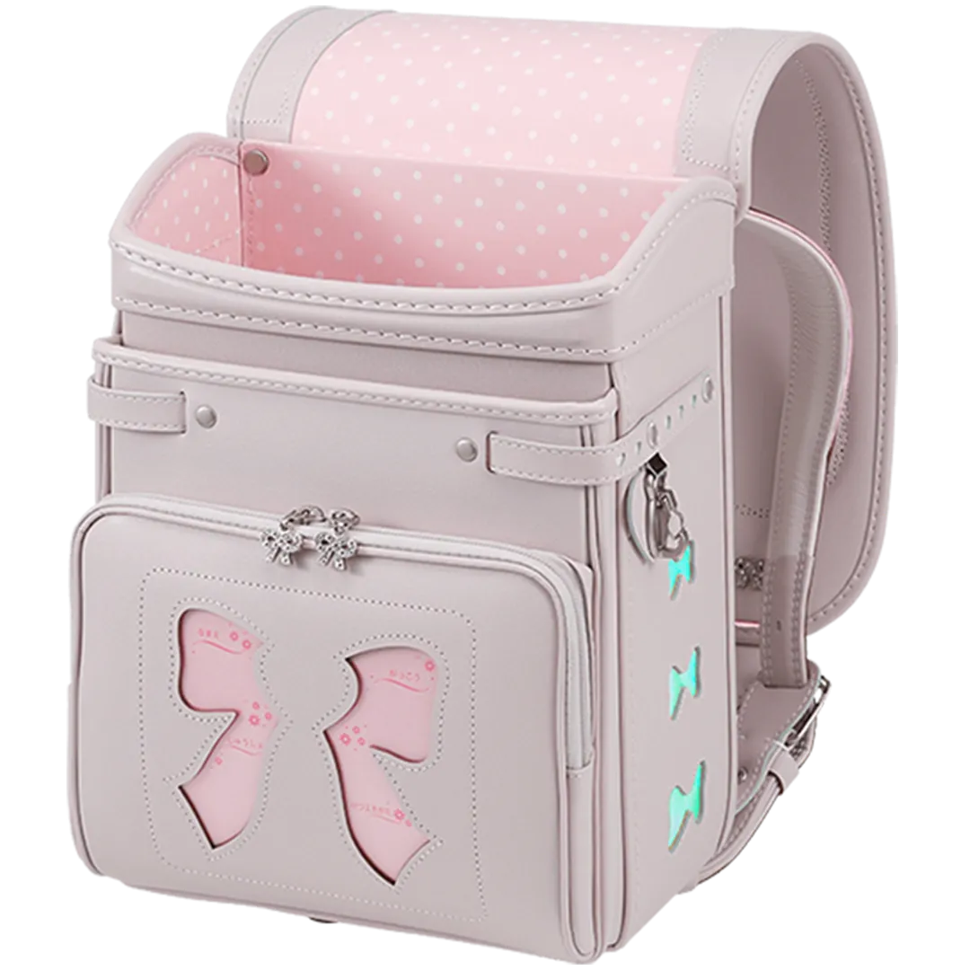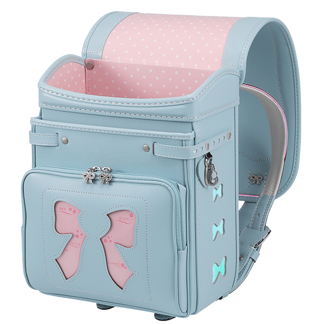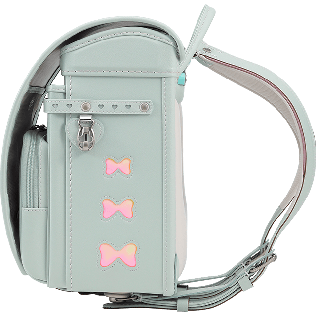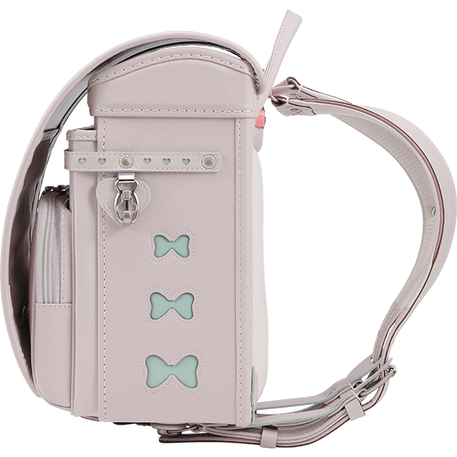 他にはない、上品なパステルカラーが魅力的なランドセル。昼も夜も光るリボンで特別なデザインを楽しんで。
