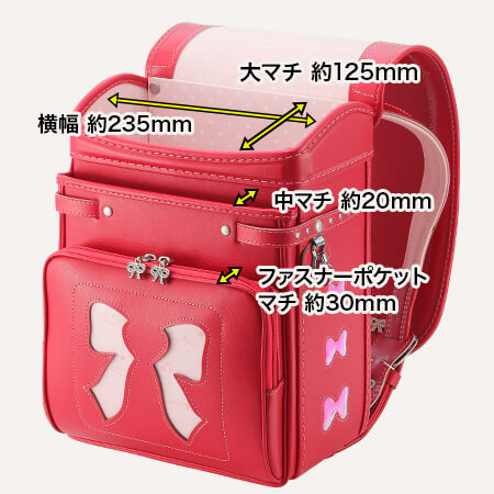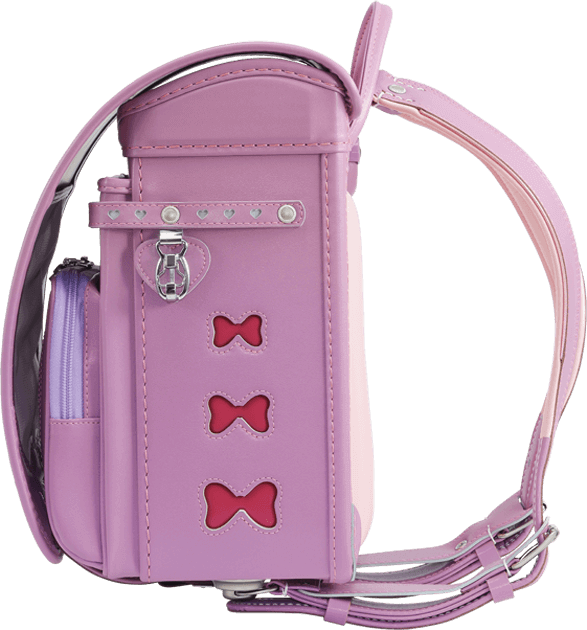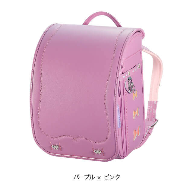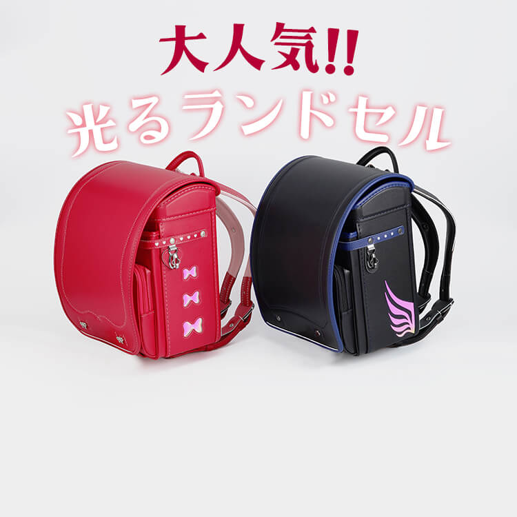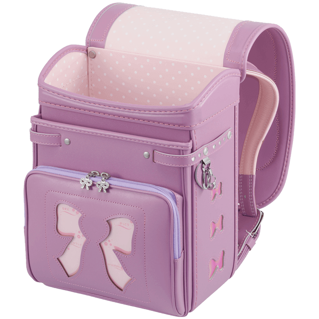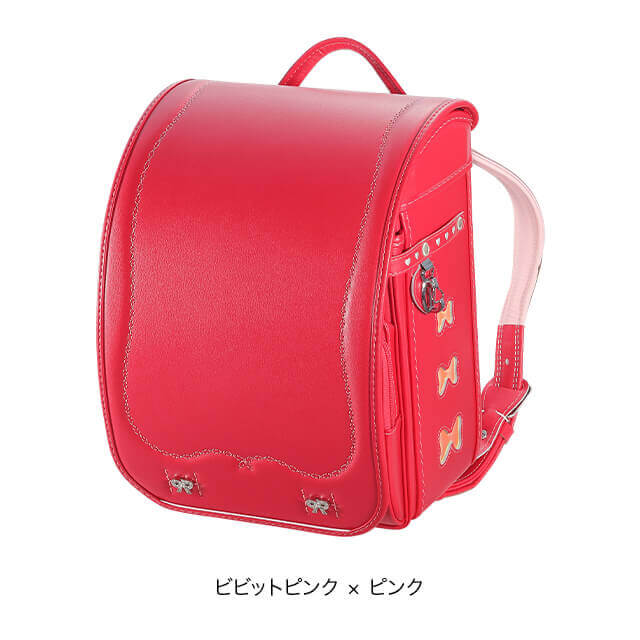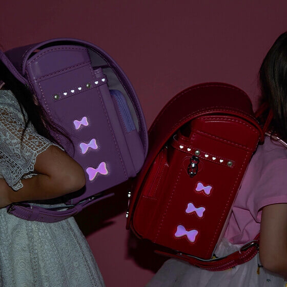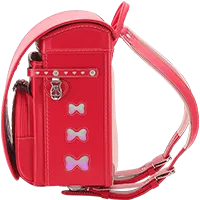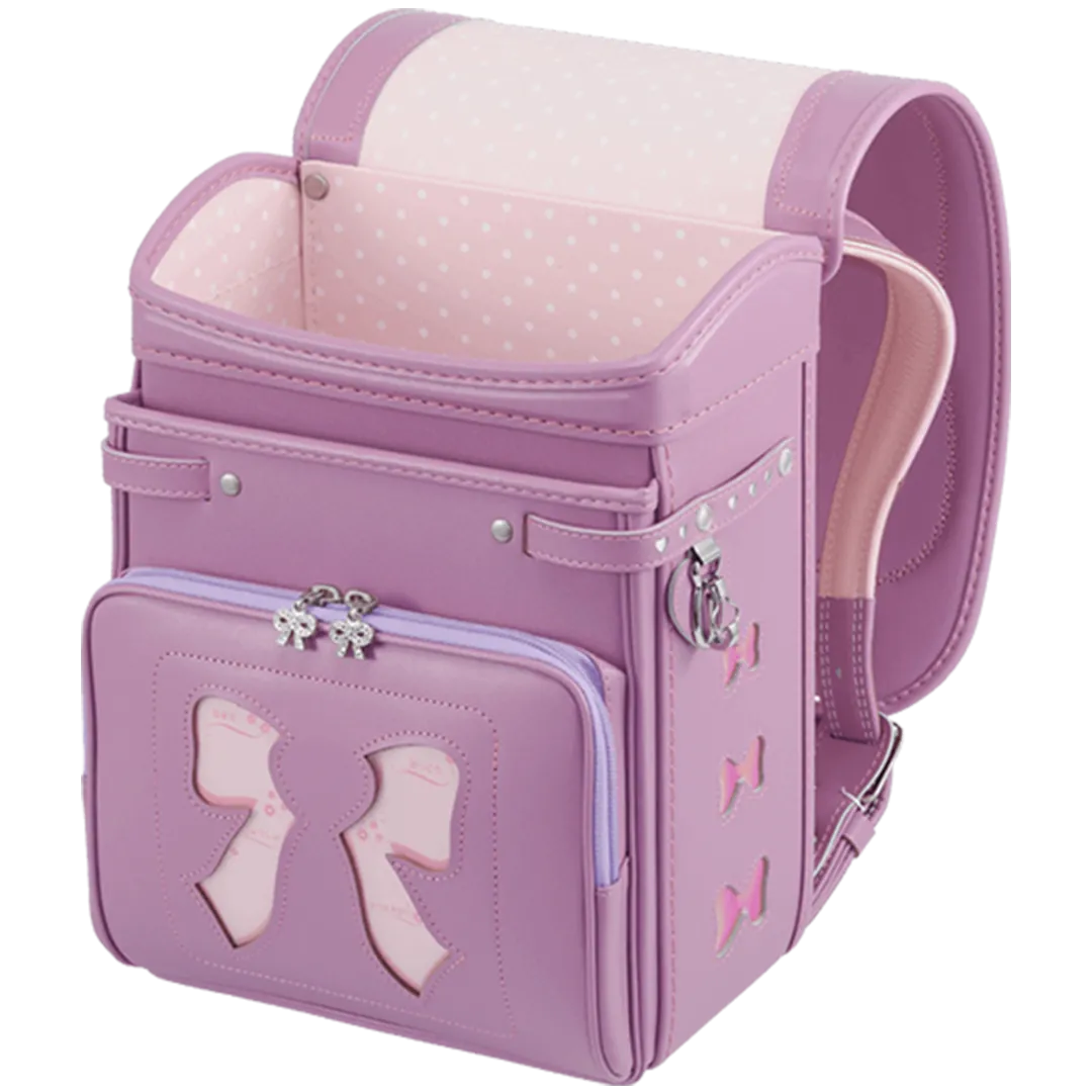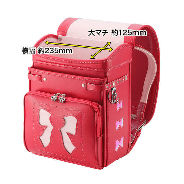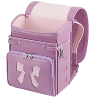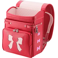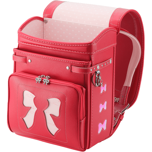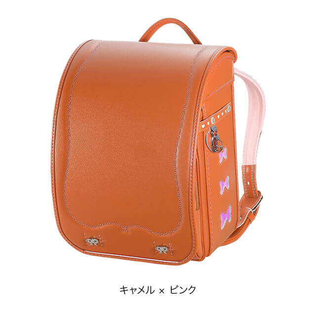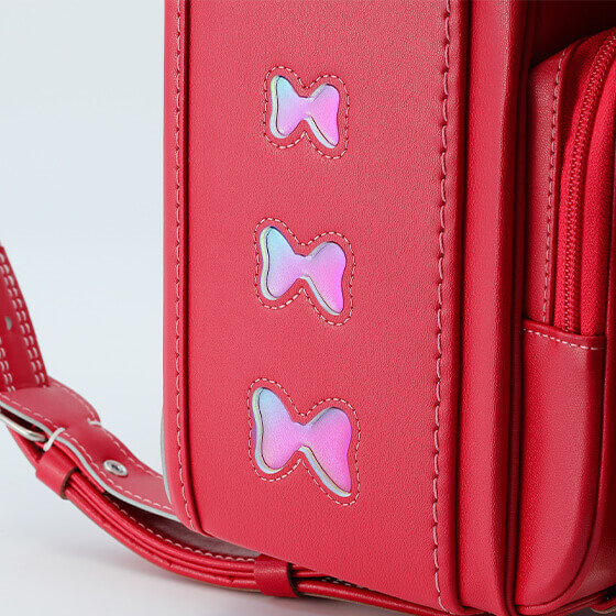 キラキラ光るリボンがキュートなランドセル。女の子に大人気のスイートなカラーバリエーションと、ぷにっと質感のリボンに注目。フラッシュ撮影でリボンにキラキラ輝く魔法をかけよう。