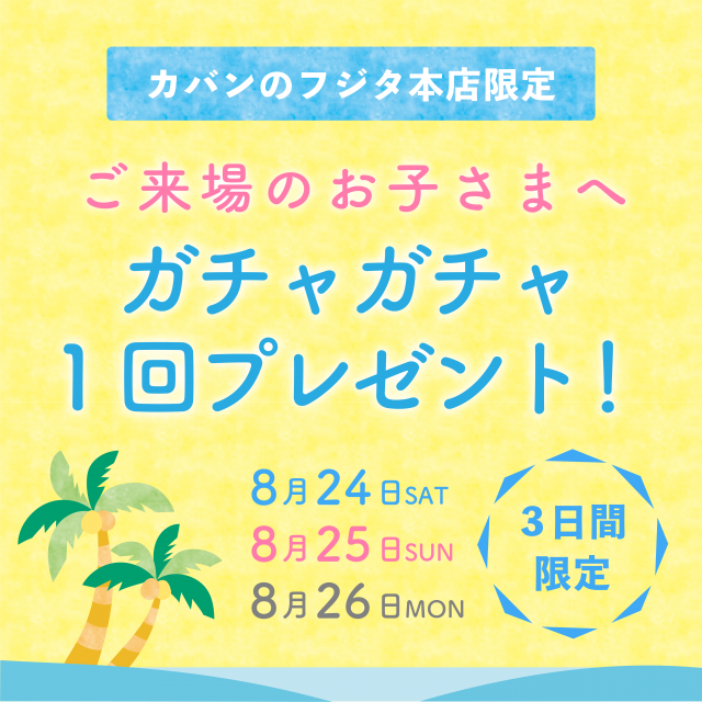 8月24日(土) ~ 8月26日(月)までランドセルのご見学でご来店されたお子さまへガチャガチャ一回チャレンジ開催!