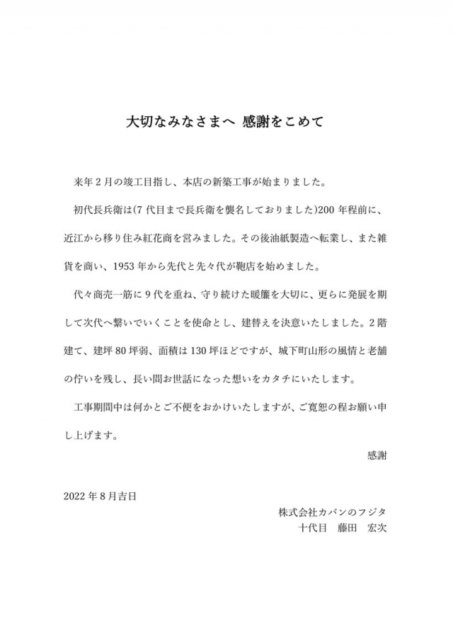 いつもカバンのフジタをご愛顧いただき誠にありがとうございます。