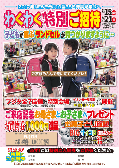 2017年カバンのフジタ スペシャリティランドセルのNEWモデルを一堂に展示、ご覧いただける発表見学会です。 実際に見て触って、スペシャリティランドセルを実感してください!ご来店記念特典もご用意しております。 お子さまの喜ぶ笑顔をスタッフ一同、心待ちにしております。ぜひ、ご家族そろってお越しください。