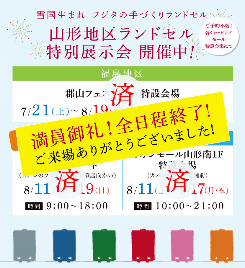 ※福島地区:福島店・郡山フェスタ店は、2018年11/30をもちまして2019年度ランドセル展示を終了いたします。