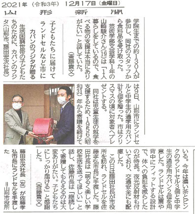 山形新聞にランドセル寄贈式が紙面掲載いただきました