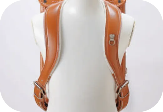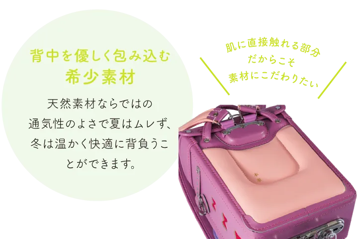 肩ベルト裏・背あてにはふっくら天然牛革を使用。 人工皮革は強く元にもどる特性があるのに対し、天然牛革は使い込むほどに伸びたり、なじんでいく特性があります。 そのため、卒業までの6年間、体型・体格の変化にも優しくなじみ、包み込むようにフィットします。