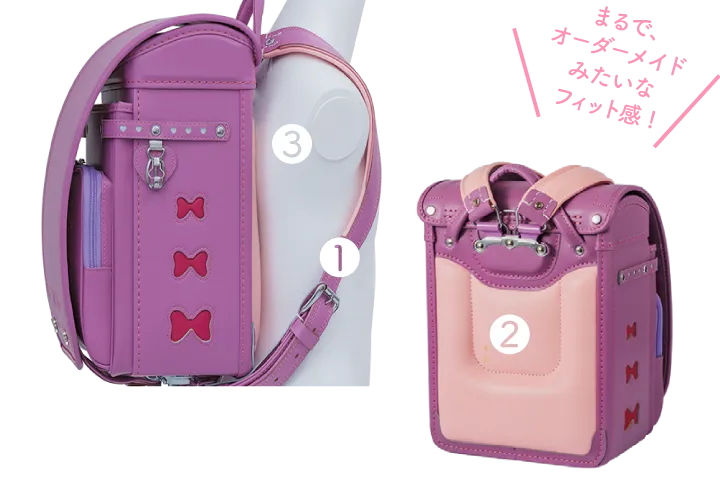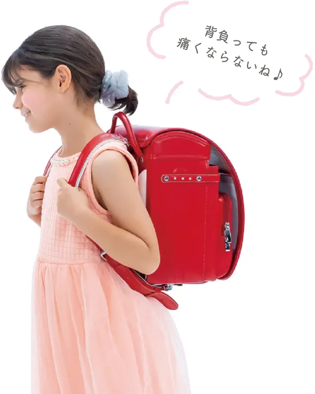ランドセルの重さを肩・背中(肩甲骨)の2箇所だけで支えるのではなく、肩・背中・腰の3箇所にぴったりフィットして、広い面積で重さを分散させます。肩にかかる負担は最小限になり、「軽い背負い心地」を実現しました。