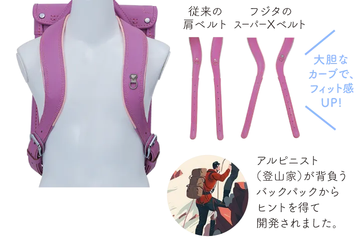 スーパー X ベルトはランドセルを背負った姿を正面から見ると、アルファベットの「X」 のような形状をしています。 曲線でできているヒトの体に沿うように、肩から胸・脇腹にかけて大きくカーブして、ランドセルと背中をぴったりフィットさせ、全体の重みを分散させます。