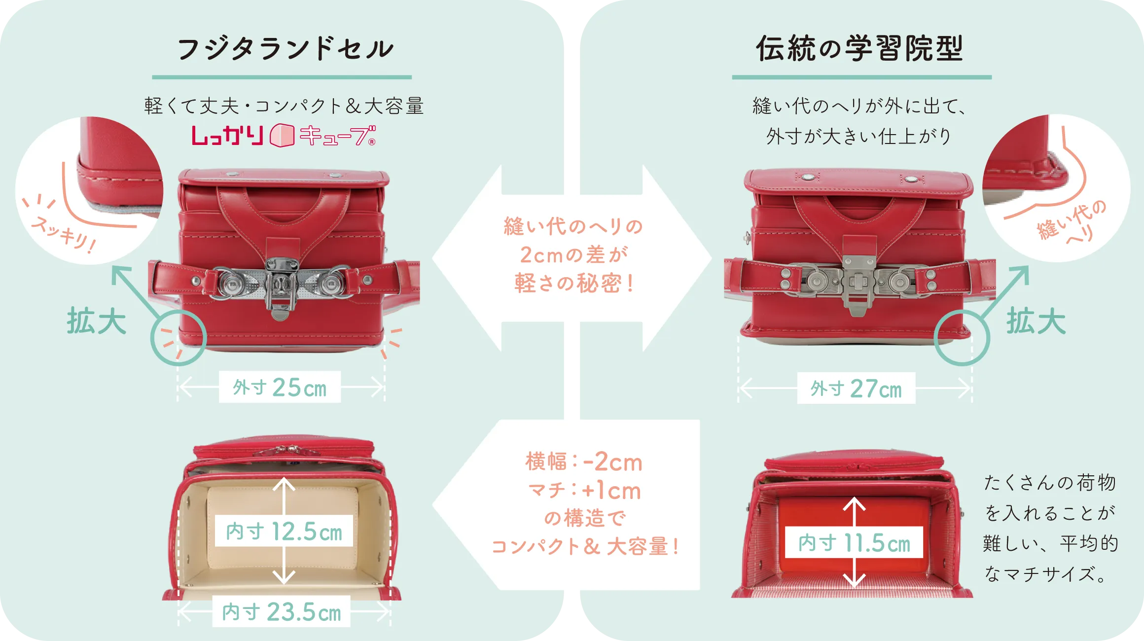 従来の構造に比べ、大容量を叶えながら軽くてコンパクトなランドセルを実現しました。