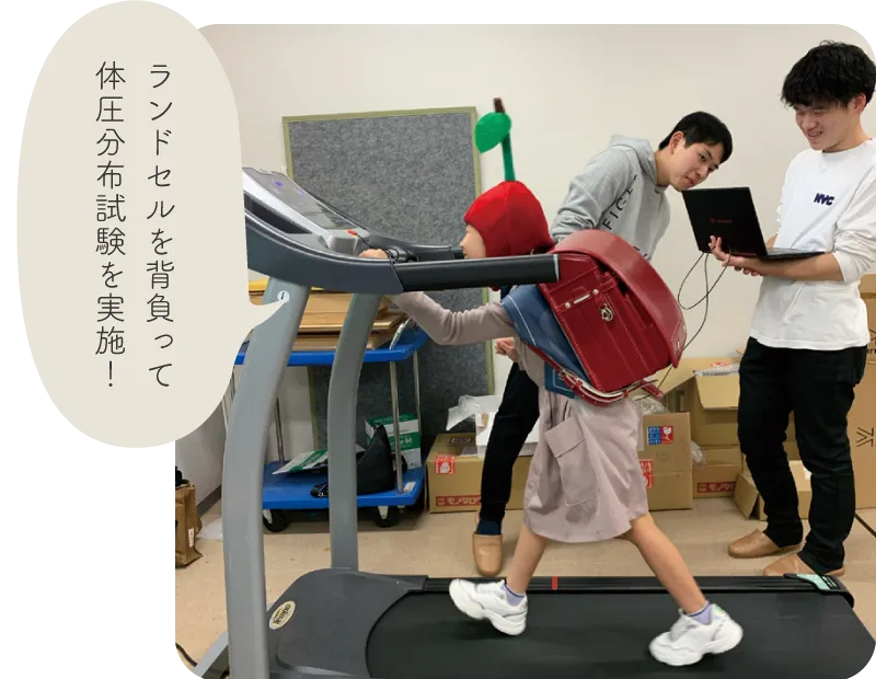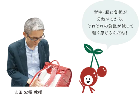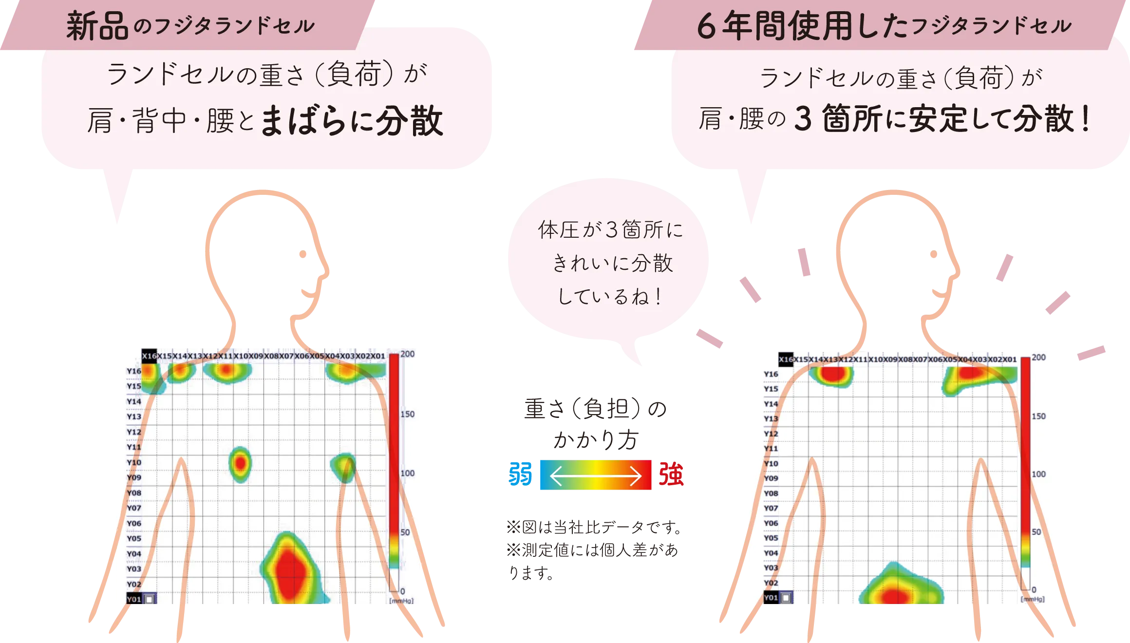 実際にフジタのランドセルを背負っている時、肩や背中や腰にかかる重さ(負荷)はどのようになっているのか、信州大学の吉田教授へ検証を依頼し「背負い心地」を見える化しました。