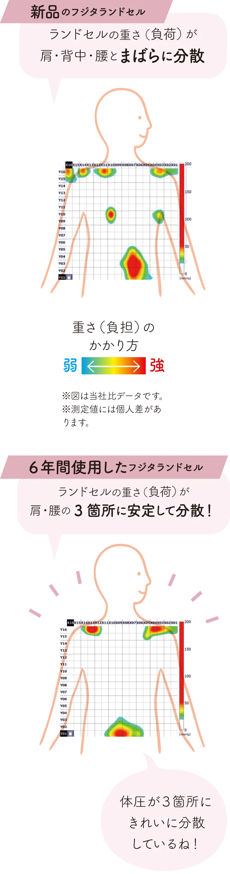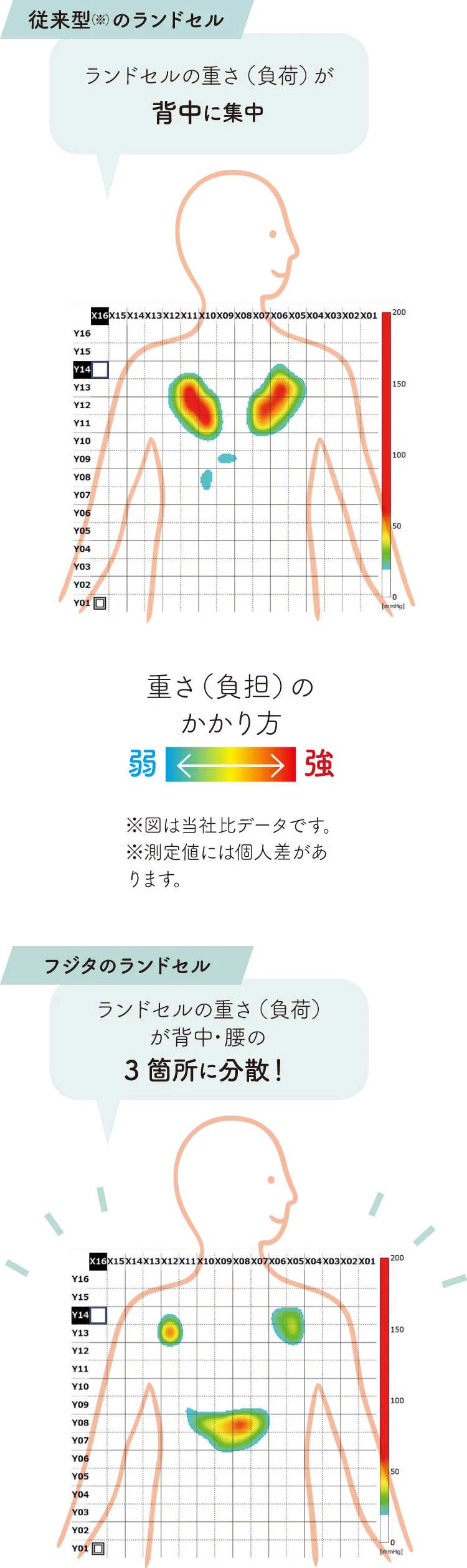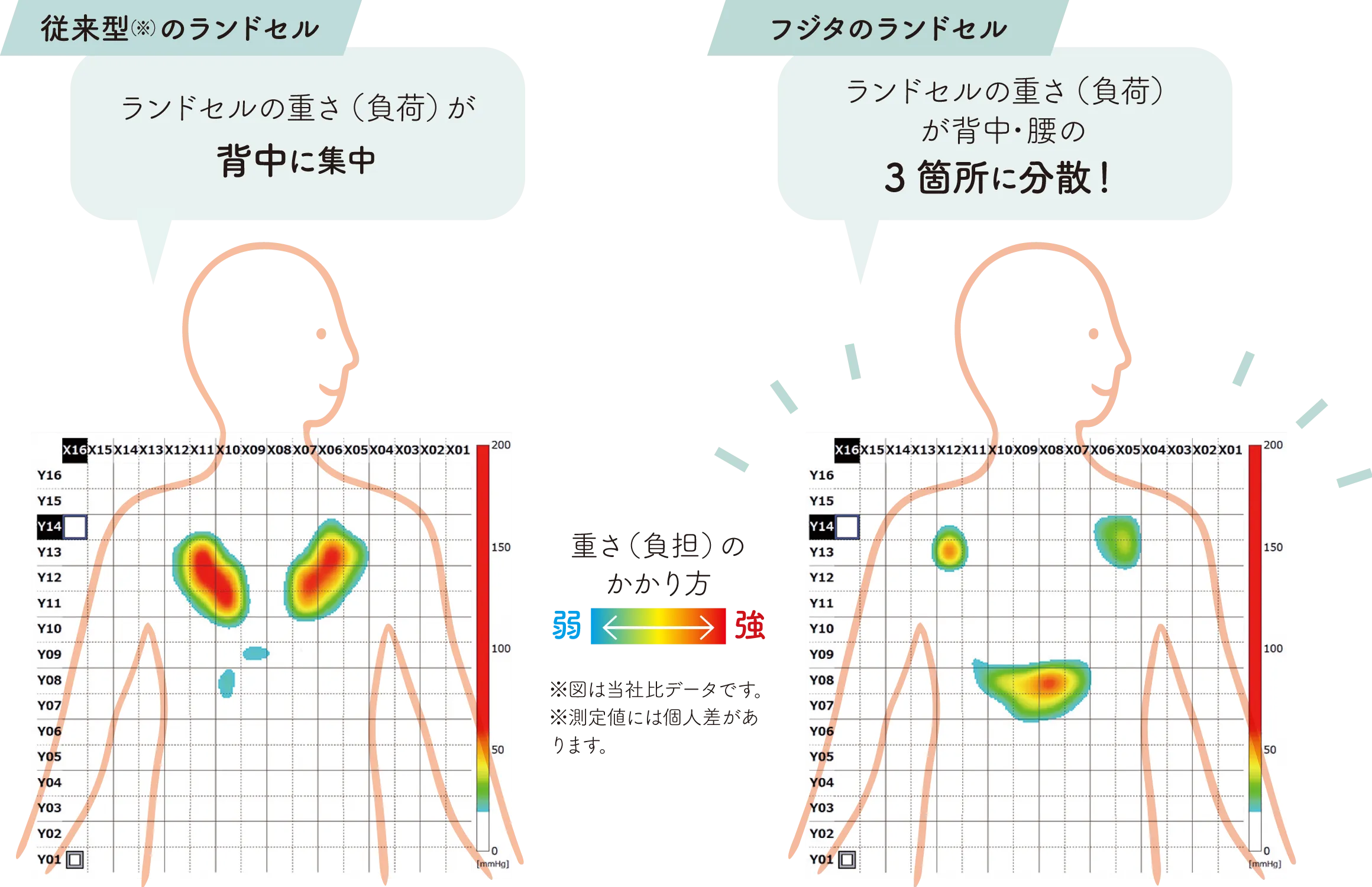 従来型※のランドセル、フジタのランドセルと背中の間にそれぞれ体圧測定器を入れて計算しました。