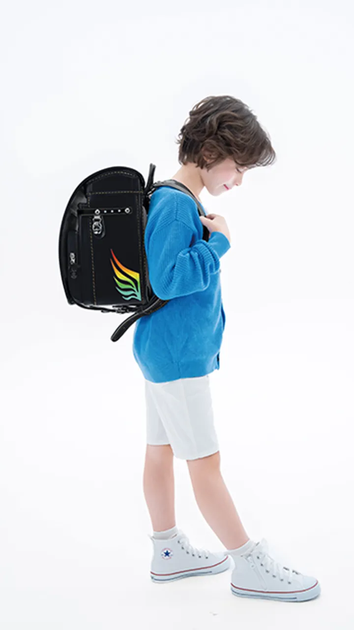 きらきら虹色に輝くツバサが存在感をアピール。多方向からのライトに反射して光るランドセルは未来へ羽ばたくきみに大きな勇気をくれるはず。